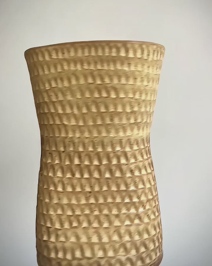 Bu el yapımı vazo, yüzeyinde kullanılan kabartma desenleriyle dikkat çekiyor. Tekrarlayan dokular, çamurun ve kendi hazırladığım sırın sıcak tonuyla birleşerek modern ve rustik bir görünüm sunuyor. Formun belden daralıp yukarı doğru açılması, vazoya hem zarif hem de dengeli bir duruş kazandırıyor.