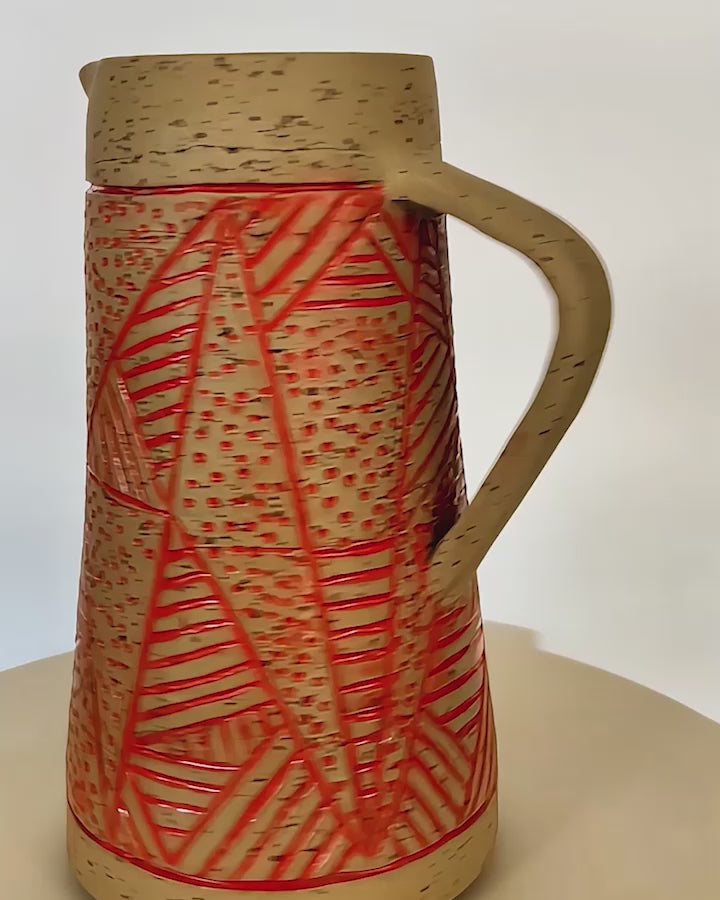 Bu el yapımı seramik sürahi, doğal stoneware çamurdan tornada şekillendirilmiş ve üzerine turuncu renkli geometrik desenler uygulanmıştır. Noktalı yüzey detayları ve çizgisel formlar, parçaya hareketli ve modern bir görünüm kazandırır.
