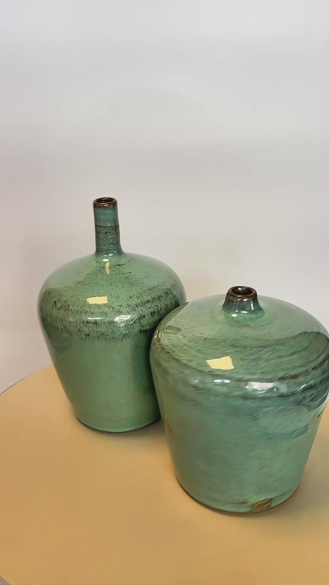 Doğal zarafeti modern bir çizgiyle buluşturan bu vazo ikilisi, stoneware çamurdan üretildi ve kendi hazırladığım sır ile tamamlandı. Yeşilin derin tonları, yüzeydeki hafif geçişlerle zenginleşerek sıcak ve huzurlu bir atmosfer yaratıyor. İkili olarak sergilendiğinde güçlü bir bütünlük sağlarken, tek başına da dekoratif bir vurgu parçası olarak öne çıkıyor.