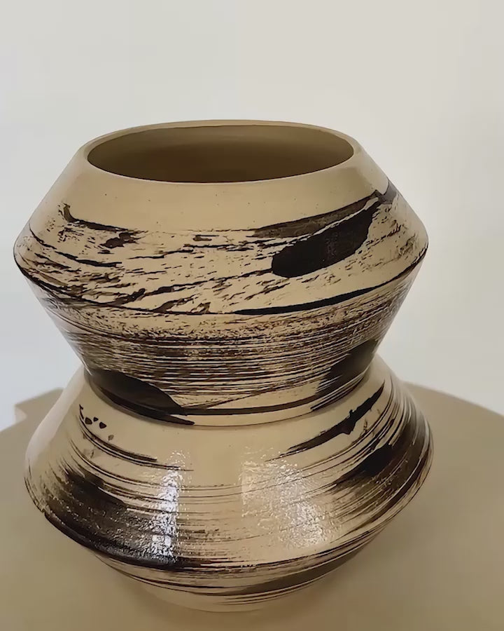Bu el yapımı seramik kase, tornada stoneware çamurla şekillendirilmiş ve sade formu üzerine siyah fırça darbeleriyle modern bir kontrast kazandırılmıştır. Doğal krem zemin üzerinde özgür fırça hareketleri, her parçayı benzersiz kılar.