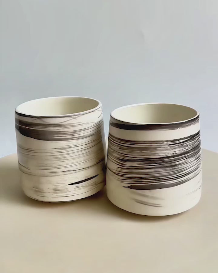 Minimalist formuyla öne çıkan bu el yapımı bardak, beyaz zemin üzerinde rastlantısal siyah fırça darbeleriyle karakter kazanıyor. Her fırça izi özgün olduğundan, her parça tek ve eşsizdir.