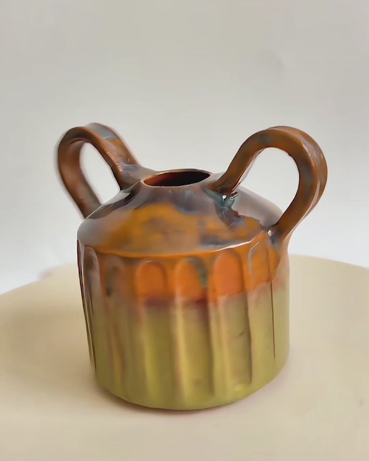 Bu el yapımı seramik vazo, tornada Menemen çamuruyla şekillendirilmiş ve kendi hazırladığım özel sırla kaplanmıştır. Gövde üzerindeki dikey kabartmalar, yüzeydeki yeşilden turuncuya geçişlerle birleşerek dikkat çekici bir doku ve renk armonisi yaratır.