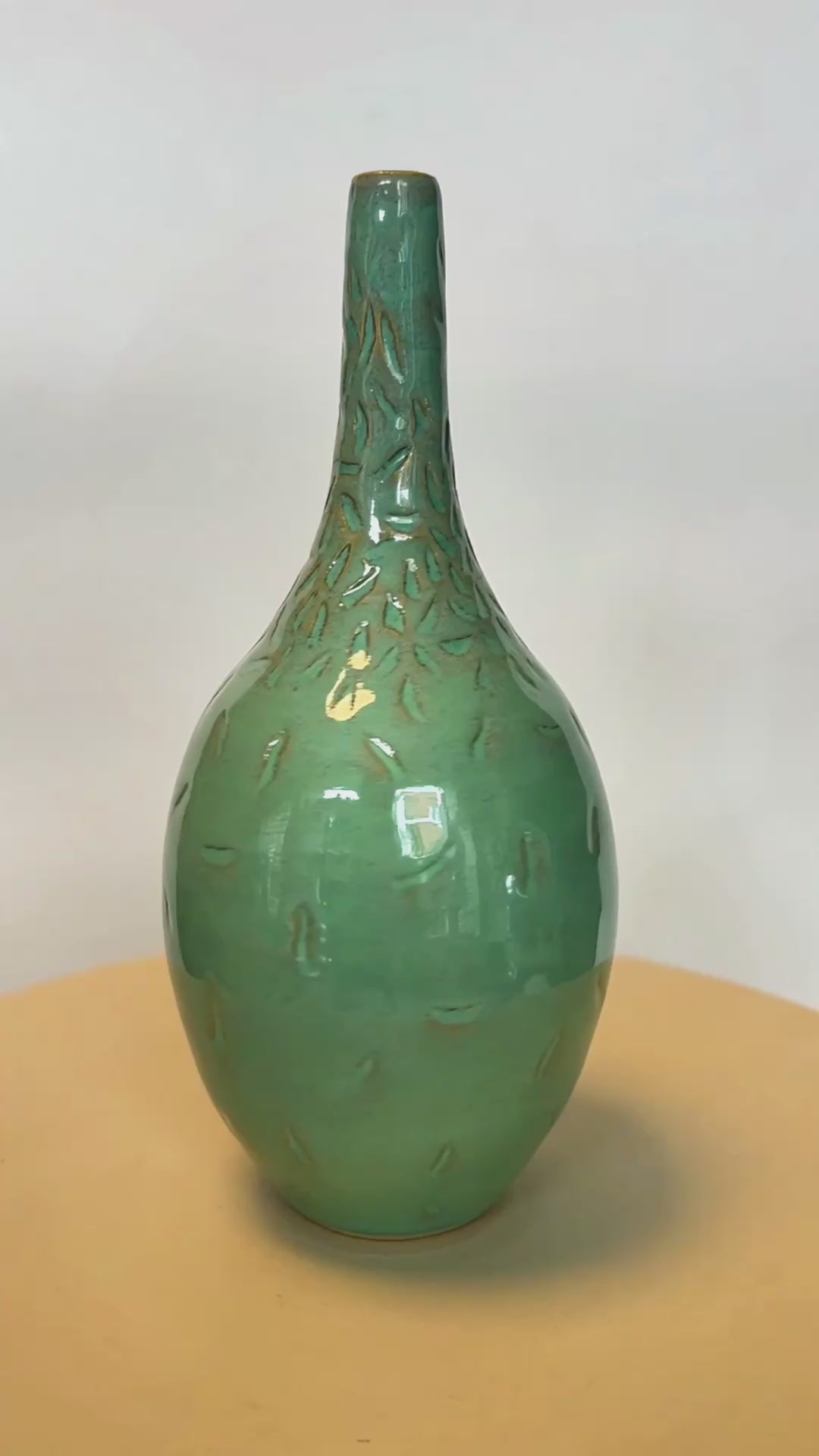 Stoneware çamurdan üretilen bu zarif vazo, kendi hazırladığım sır ile kaplandı. Gövdesinde yer alan serbest kazıma dokular, sırın derin tonlarıyla birleşerek doğal ve hareketli bir yüzey etkisi yaratıyor. Organik formuyla minimalist bir estetik sunarken, tek başına veya çiçeklerle dekoratif olarak kullanılmaya uygun.