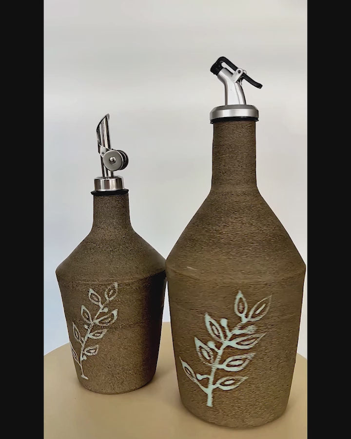 Bu el yapımı seramik şişe, zeytinyağı ve diğer sıvı soslarınızı şık bir şekilde sunmak için tasarlanmıştır. Tornada şekillendirilmiş stoneware çamurdan üretilmiş olup, yüzeyinde minimalist yaprak motifiyle süslenmiştir. Doğal kahverengi tonları ve mat dokusuyla mutfağınıza hem estetik hem de fonksiyonel bir dokunuş katar.