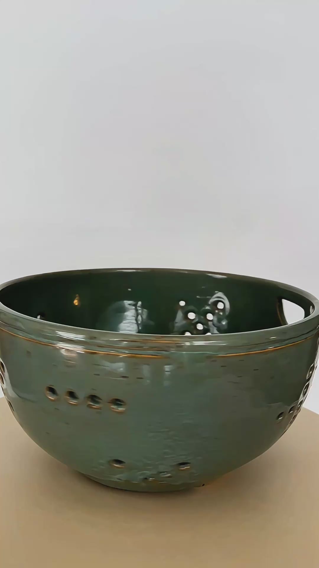 Stoneware çamurdan tornada şekillendirilerek üretilen bu el yapımı kevgir, özel olarak hazırladığım sır ile kaplanmıştır.