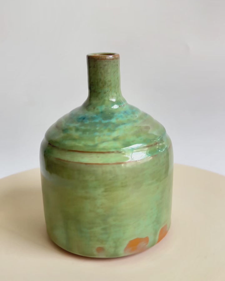 Bu el yapımı vazo, Menemen çamuruyla tornada şekillendirilmiş ve kendi hazırladığım özel sırla kaplanmıştır. Yüzeydeki yeşil tonların akışkan efektleri, doğal kahverengi yansımalarla birleşerek zengin ve dinamik bir görünüm yaratır.