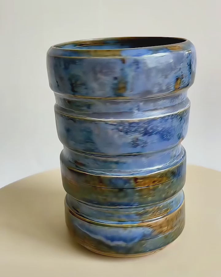 Bu el yapımı seramik vazo, tornada stoneware çamurla şekillendirilmiş ve derin mavi ile kahverengi tonlarının birleştiği özel sırla kaplanmıştır. Gövdesindeki bantlı girinti-çıkıntılar, parçaya güçlü ve karakteristik bir form kazandırır.