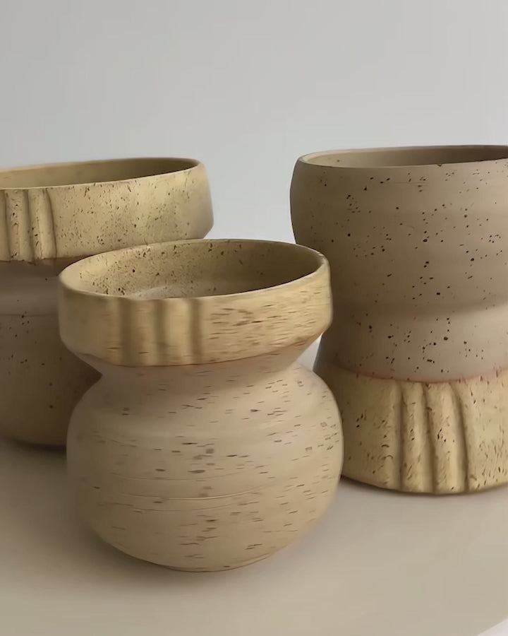 Bu el yapımı saksı, tornada stoneware çamurla şekillendirilmiş olup, doğal bej tonlarında minimalist bir görünüme sahiptir. Gövdenin alt kısmında yer alan dikey çizgi detayları, parçaya güçlü bir ritim ve heykelsi bir estetik kazandırır.
