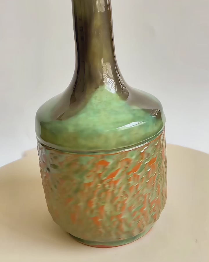 Bu el yapımı vazo, Menemen çamuruyla tornada şekillendirilmiş ve hazırladığım özel sırla kaplanmıştır. Uzun boyunlu formu zarif bir siluet sunarken, gövdesindeki dokusal yüzey hareketi parçaya heykelsi bir derinlik kazandırır. Yeşil ve toprak tonlarının buluştuğu yüzey, doğal ve modern bir estetik oluşturur.