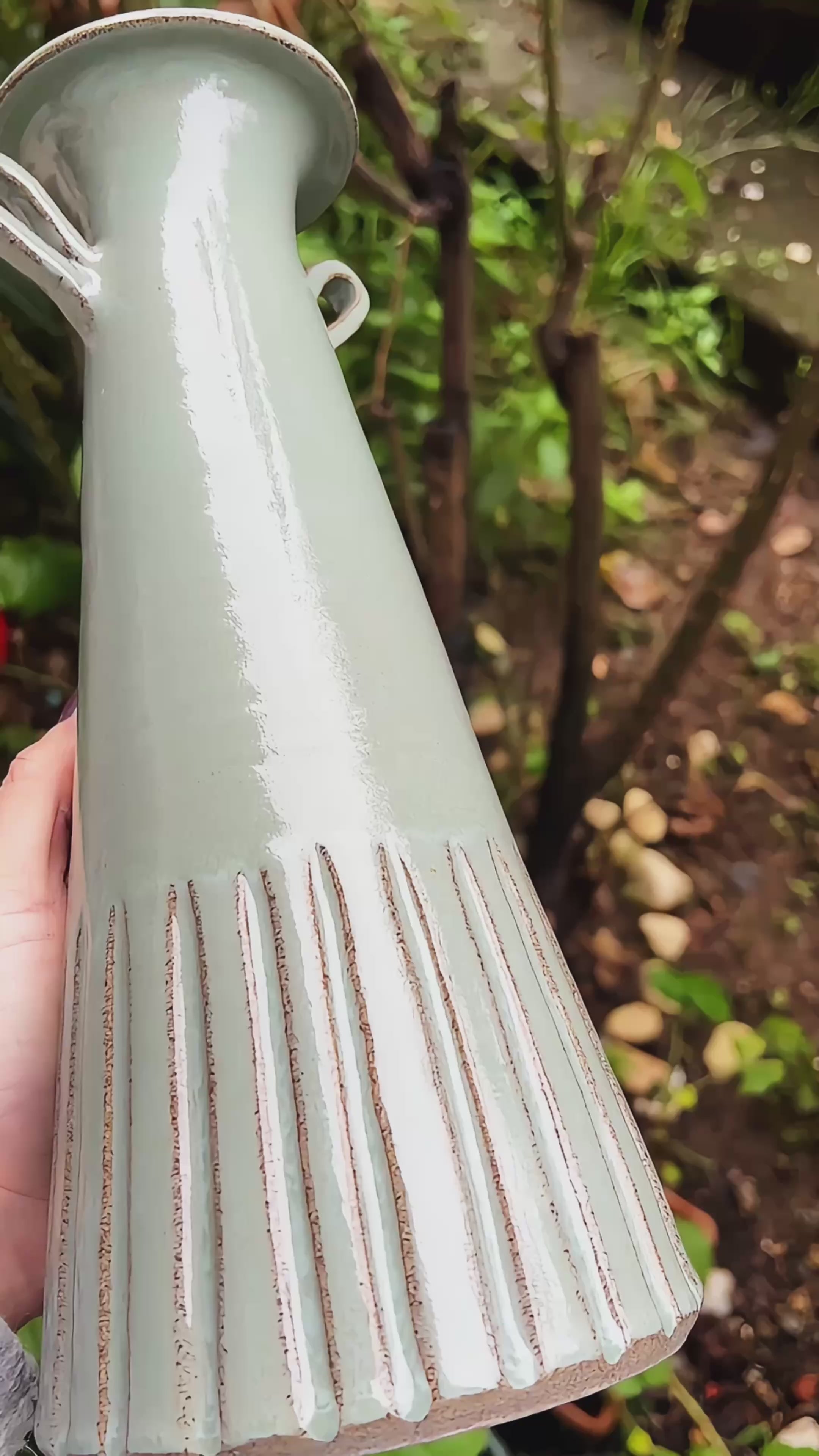 Stoneware çamurdan üretilen bu parça, kendi hazırladığım özel sırla sırlanmıştır. Sır yüzeyinde görülen akışlar ve ton geçişleri, vazonun el yapımı karakterini vurgular ve her parçayı kendine özgü kılar. Alt kısımdaki dikey dokular formu yere sağlam basan bir silüetle tamamlar.